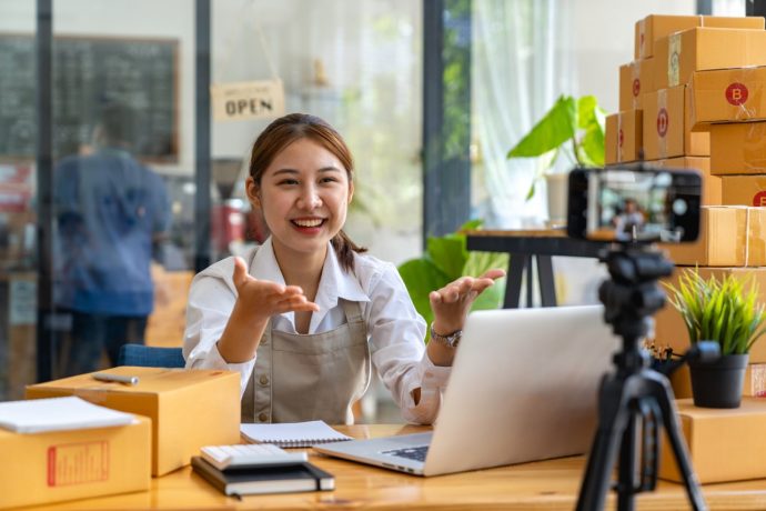 Startup small business SME. Beautiful asian entrepreneur using camera live streaming online chat with her customer. Successful SME business online concept..